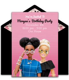 Use the messaging feature in our Online Invitations to encourage your guests to dress up in their favorite Barbie-inspired costumes. Barbie has had many careers through the years - from Flight Attendant to Pilot, Astronaut, Presidential Candidate, Olympic Athlete, Marine Biologist, and many more. Between her many careers and her many iconic outfits like the 1959 Black and White Striped Bathing Suit and the Business Suit and Cocktail Dress of 1985's Day to Night Barbie, your guests will have a huge range of options to choose from. And don't forget - Ken has his own range of classic looks! Choose your favorite decorations in Barbie pink and get the Barbie party started!