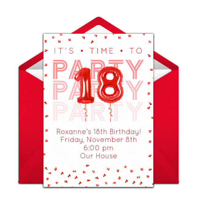 If you want the number 18 front and center in your invites, check out these online 18th birthday invitations that can be customized with event details and sent by email or text instantly.