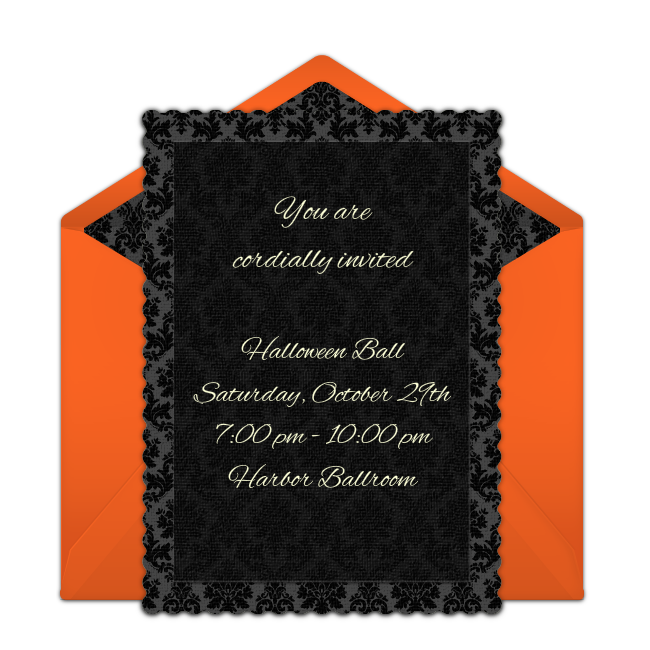 Add a sophisticated twist to Halloween this year and throw a black tie Halloween party. Plan a formal Halloween party with fancy details. Select formal invitations with a Halloween theme. Decorate the room with elegant decorations covered in cob webs. Serve delicious food and name each menu item with a Halloween-inspired name. Finally, plan an activity to entertain your guests.halloween invitations black tie gala.png299.58 KB