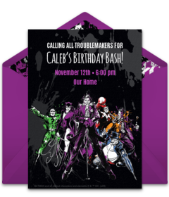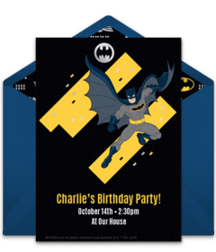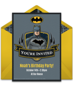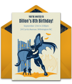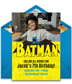 Send your online Batman birthday invitations 3-4 weeks before the party. Personalize your favorite design with important event details and incorporate Batman into your invite wording (“Batman invites you to Gotham City in honor of Evan's 7th birthday!"). If you want the kids to come dressed as their favorite superhero, make a note on the invitations so parents can be prepared. When your invites are ready, send by text or email and gather RSVPs in minutes.