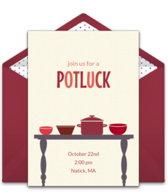 Want to keep it small and fun? How about a beer bash, or an office potluck. Our potluck invitations even allow you to add a potluck sign up to help keep everyone organized!