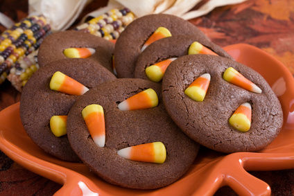 - Cookies: Make delicious candy corn cookies for Halloween. Ingredients for the candy corn cookie recipe are: 4 tbsp. unsalted softened butter, ½ cup sugar, 1 egg yolk, ¼ tsp. of vanilla extract, ¼ tsp. baking powder, ¼ tsp. salt, ¾ cup flour and a few handfuls of candy corn (35-40 pcs). Preheat your oven to 350 degrees. Combine the butter and sugar, and beat the mixture in a bowl. Add the egg yolk, baking powder, salt and vanilla. Slowly add the flour and form the cookie dough. Use a teaspoon to scoop out the dough and roll the dough into balls and place them on a cookie sheet. Bake for 10-12 minutes. Once out of the oven, press a piece of candy corn into the middle of each cookie.