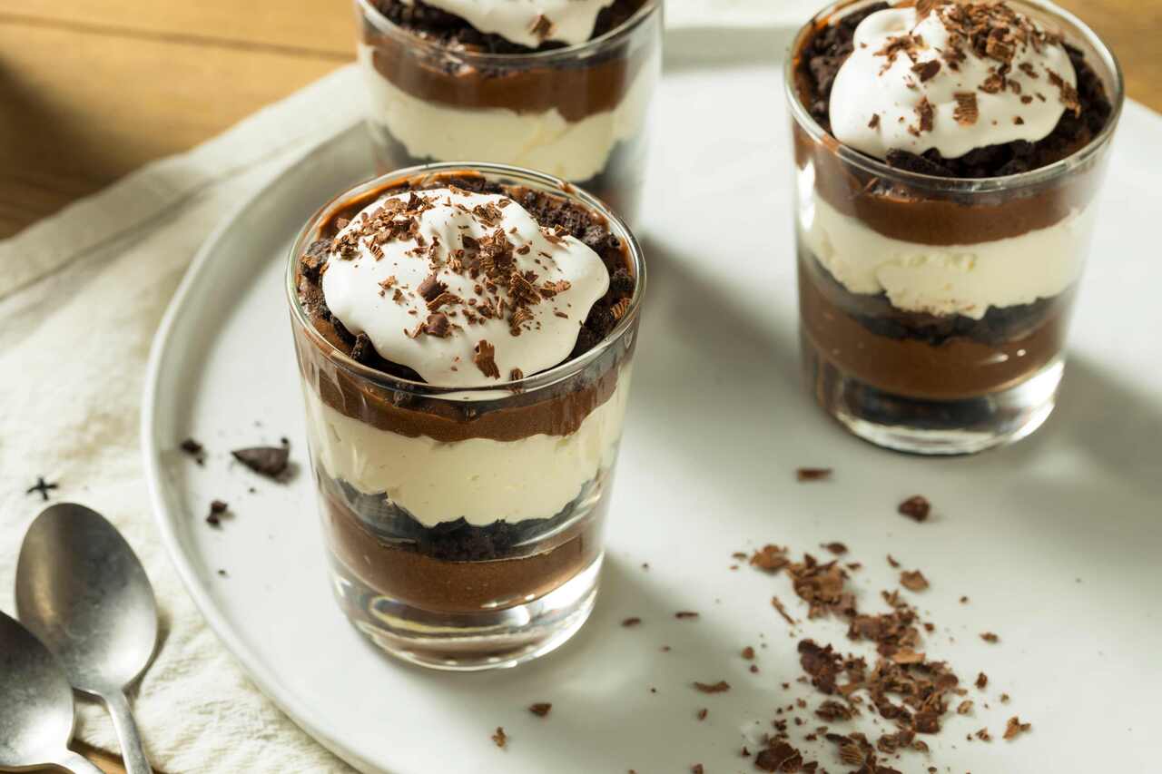 To your parfait glass, add a layer of the pudding/whipped topping mixture. You can do this easily by using a piping bag, or a heavy duty zipper bag (cup off the tip of one of the corners). Add another layer of chocolate brownies or cake, and top off with more pudding mixture. Garnish with shaved chocolate, if desired.