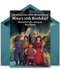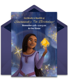 Start your celebration off on the right foot with gorgeous Disney's Wish invitations that feature Asha, friends, family, and – of course – Star. Customize your favorite digital invitation with important event information, send by text or email, then easily manage RSVPs.