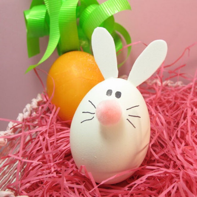 Create the fun Easter bunny eggs fast, and with no dye required! All you need are small pink pom-poms, white foam, a black marker, and glue. Simply cut out bunny ear shapes from the white foam and glue them onto the top of the egg. Next, glue a pink pom-pom to the center of the egg for the nose. Once the glue is dry, draw on eyes and whiskers. These adorable bunny eggs are perfect for an Easter egg hunt, an Easter basket, or as a part of your dinner table décor.