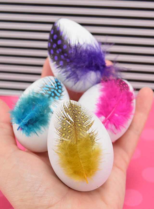 • Once your initial layer is applied, you can continue to layer feathers of different colors all over your Easter eggs to achieve a bright, upbeat look that will knock those dyed eggs out of the park.