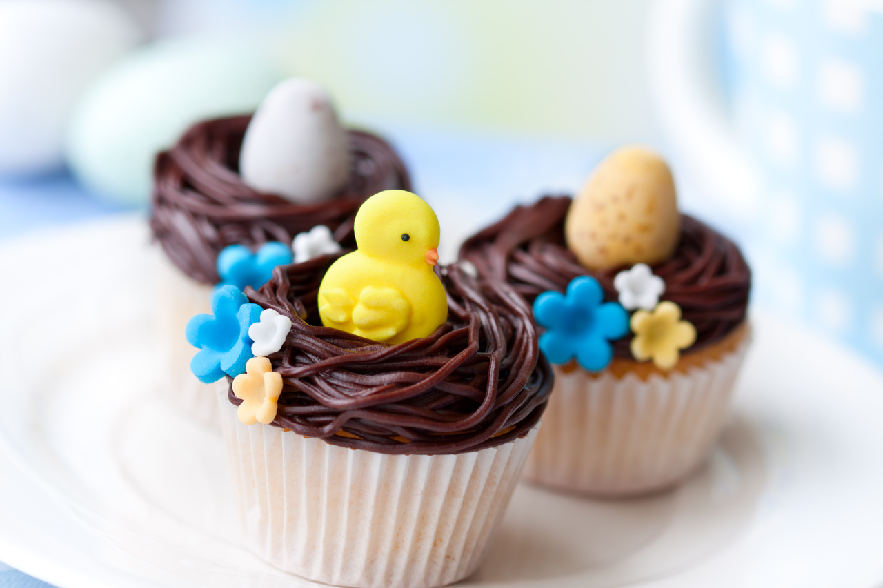 For this kids Easter recipe, first bake a dozen cupcakes following the package on the box. If your kids are old enough, they can help in the mixing and baking process. Once the cupcakes have cooled, fill a pastry bag with the chocolate frosting. Use a multi-opening tip to create a grass-like design on top of each cupcake. Ask the kids to decorate each "nest" with small candy eggs, chicks, and flowers!