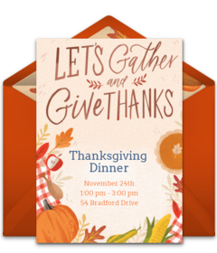 Finally, before you plan your dessert menu, be sure to send online Thanksgiving invitations to help set the stage for your gathering. Add important event details to your favorite invitation, customize the font, colors, and postage stamp, then send by text or email.