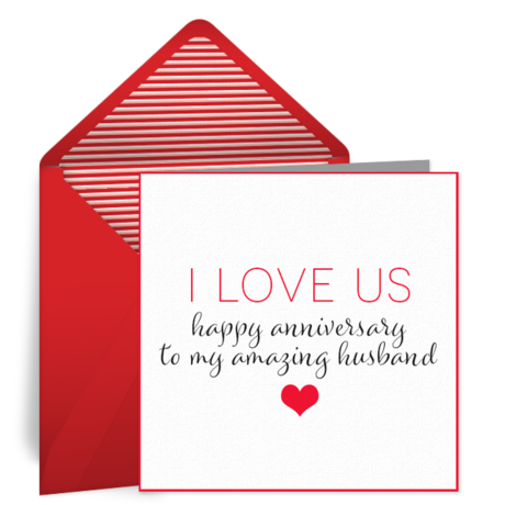 - Free Anniversary eCards for Him: For an anniversary greeting card for your husband, choose a simple design that celebrates your partner in life, like this Husband anniversary card. Find an envelope stamp that reflects a personal interest or hobby, and customize the message inside the card with a sweet sentiment.