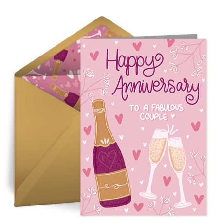 - Free eCard Anniversary Greeting for a Couple: If you want to celebrate your parents’ anniversary, or the wedding anniversary of some friends, find a neutral design like this Fabulous Couple anniversary card. Write about a favorite moment from the couple’s wedding, how much you appreciate the example they’ve set, or your best wishes for the years to come.