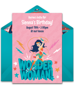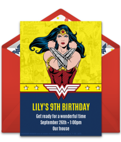 Personalize your favorite Wonder Woman birthday invitation and send by text or email in minutes. Decorate your space with red, blue, and gold balloons and streamers. When it comes to food, use Wonder Woman's star-spangled outfit for inspiration. Use star-shaped cookie cutters to make bite- sized deli sandwiches and star-shaped Wonder Woman watermelon slices. Place the watermelon in a bowl with blueberries and mini marshmallows for a patriotic and yummy snack. For dessert, check out this gorgeous Wonder Woman Funfetti cake recipe.
