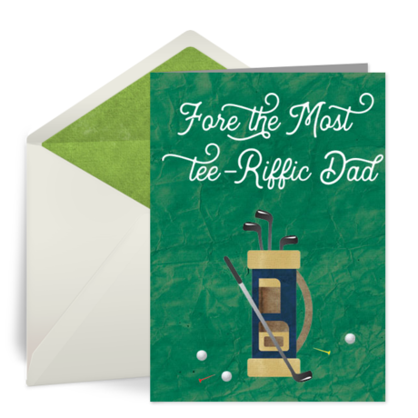 Help your dad score a hole in one this summer with a golf-themed gift basket filled with all the golfing essentials. In his basket, include: golf tees, golf balls, a glove, divot tool, ball marker, golf shoe bag, towel, personalized golf polo shirt with his initials, and a credit towards a round at his favorite course. Last but not least, write a personal message in this Golf Father's Day card or Tee-Riffic Father's Day card to really make him smile!