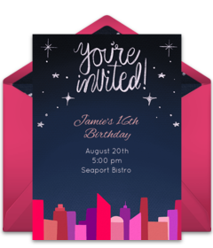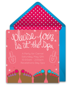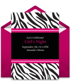 - Theme: Choose a design for your girls' night invites that matches the type of event that you are organizing. For example, maybe the event is a girls' night in and it's a spa-themed party. Choose spa-themed girls' night online invitations. Or, maybe you are planning a fun, old-fashioned sleepover party. For this type of event, you can send girls' night in invitations with all of the details for your sleepover party, including what guests should bring. Punchbowl offers a variety of girls' night invites online that match several themes such as dancing, spa parties, book clubs, scrapbooking events, and much more.