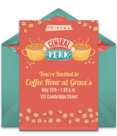 To start, send Friends themed party invitations by text or email to share important event details with guests and easily manage RSVPs online. Customize retro Friends invitations featuring the whole gang, Friends themed birthday party invitations with Monica’s peephole frame, or Friends coffee hour invitations that incorporate elements from everyone’s favorite coffee shop.