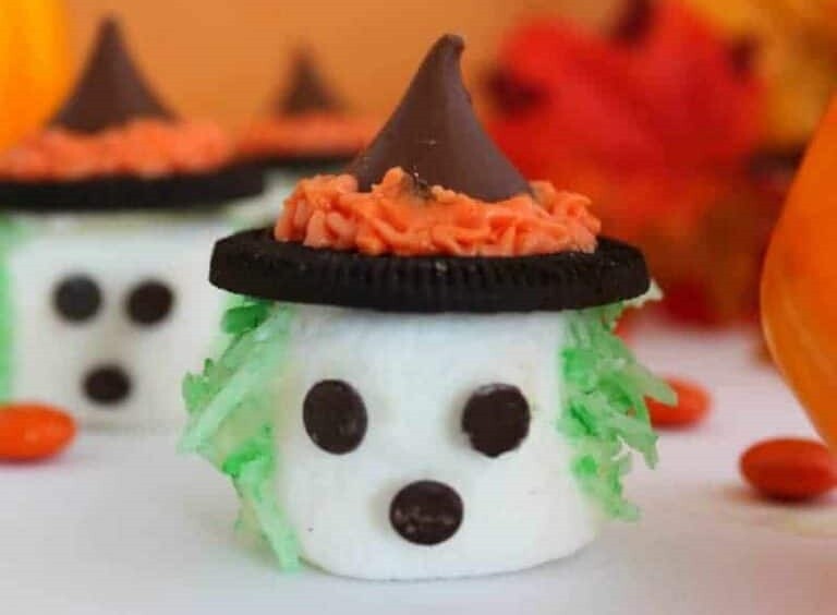 Take a big marshmallow and use some icing to attach mini chocolate chips for the eyes and nose. Then take a small plastic bag and add some food coloring to it with a little water. Add some sweetened shredded coconut and shake. Using the icing, attach the hair. Then make the hat with large chocolate wafers. You can use mini peanut butter cups or Rolo caramels topped with candy corn.