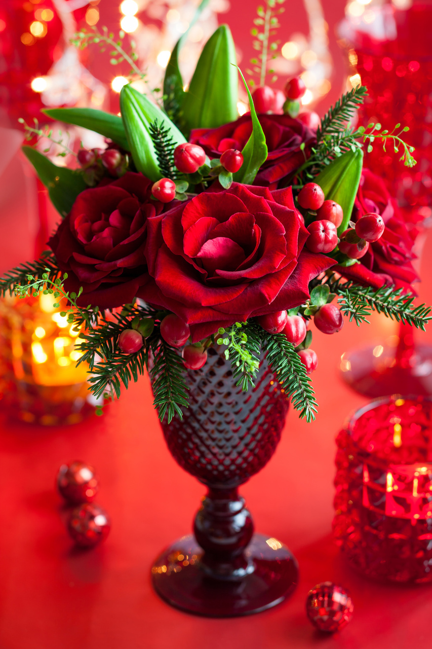 - Flowers: Decorate with traditional holiday party table decorations such as vase full of flowers. Select deep color flowers such as red, orange, and purple. For a night time holiday party, place colorful LED lights in the vase to make the water give off a festive color.