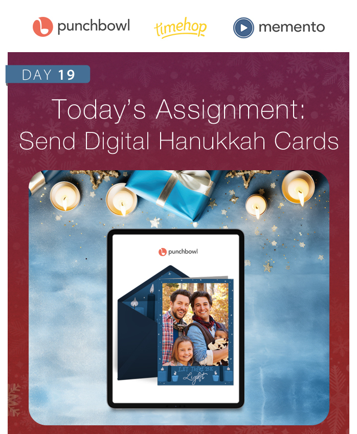 Day_19_Article.jpg423.8 KB The 25 Days of Holiday Memories is a collaboration from Punchbowl®, Timehop® & Memento® where we help you get organized and make the most of the holiday season. Sign up here and get daily assignments delivered to your inbox.