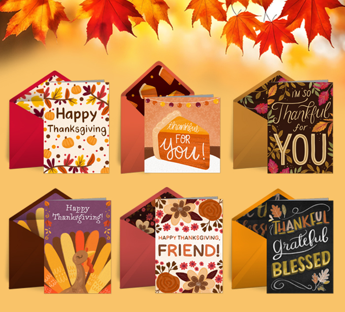 Send digital Thanksgiving cards to everyone you’re thankful for in minutes. Personalize gorgeous greetings and deliver instantly by text or email. To start, take some time and reflect on those who make a difference in your life. Here are some ideas to help get you started:
