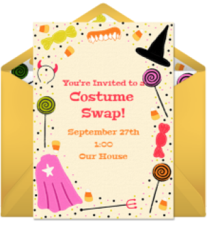 - Invitations: Send online Costume Swap invitations to all of your friends, family, and neighbors to let them know the details of the event. Pick an invitation design that uses a Halloween color scheme and include images of costumes. Be sure to tell your guests to bring all of their old Halloween costumes and accessories. Items like a boa, magic wand, face paint, cowboy hat, or fake stethoscope can really help bring a costume together.