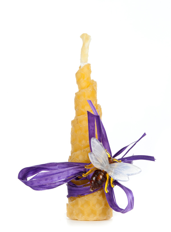 - Create handmade beeswax candles with a tapered design. Decorate with ribbon and a jeweled baby bee accent.