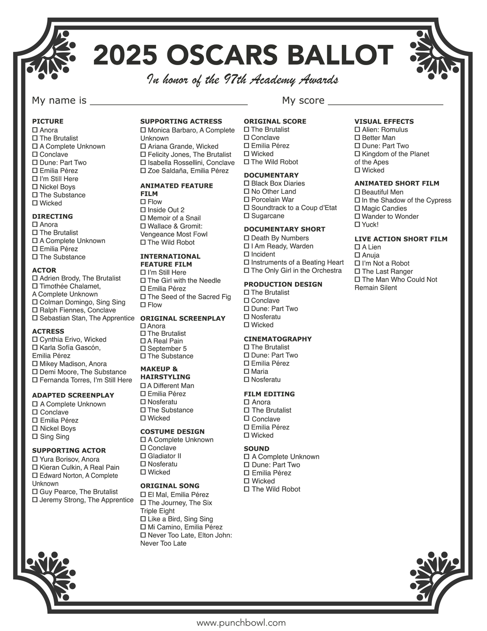 Next, download free printable Oscar ballots. Have guests fill out their ballot before the show and write their name on the top, then randomly exchange ballots so everyone can score someone else's ballot. Be sure to appoint an official scorekeeper to tally the score so everything is even at the end of the night. Punchbowl_OscarsBallot2025.jpg1.47 MB