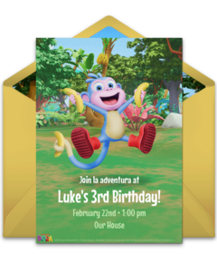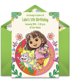 To set the stage for your Dora party, customize online Dora invitations! To start, browse gorgeous designs that include Dora and her rainforest pals (you can even upload your favorite picture of the birthday kid to this Dora Photo invitation!). Once you pick your favorite Dora birthday invitation, add all the information your guests need to know - location, date, time, and any other important details. Next, send these adorable Dora birthday invitations via email or text and easily track RSVPs online.