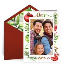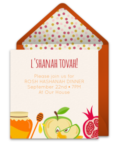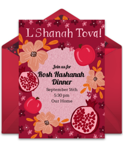 Pomegranates are usually eaten on the first night of Rosh Hashanah and symbolize fertility and abundance because of their many seeds. Choose an elegant or colorful pomegranate Rosh Hashanah invitation for your gathering and incorporate the gorgeous pink-red hue of the fruit in your decorations.