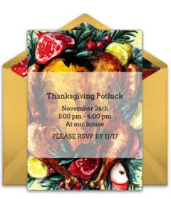 Add more Thanksgiving dishes for kids to the meal with the help of guests. Send a Thanksgiving invitation online to easily keep track of who's bringing what dish with the Potluck sign up feature. Deliver your invitations by text or email and gather RSVPs in minutes.