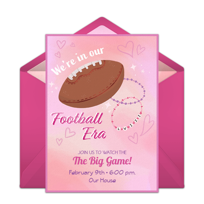 Let others know about your "No Boys Allowed" party and easily collect RSVPs online with digital Super Bowl invitations you can send right from your phone. Easily customize this Taylor Swift inspired invitation, or—if pink isn't your signature color—customize this cute Game Day Banner invitation. Bonus idea: If February 14th is right around the corner, consider hosting a combo Super Bowl-Valentine's Day party with the Heart Helment invitation or For the Love of Football invitation below.