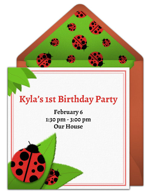 - Invitations: Send ladybug invitations for the party to kickoff the theme. Punchbowl offers a free online invitation (shown below) that's perfect for this theme! Since a first birthday is an imporant milestone for your family, try to send your invitations a 4-5 weeks prior to the birthday party.