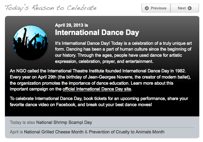 The Reasons to Celebrate may not only amuse you, but might actually give you an excuse to host a party and introduce your friends to a new occasion. Spread the word to others by adding the Reasons to Celebrate widget to your blog or signing up for daily email updates so you never miss an opportunity to celebrate something big or little on just another day!