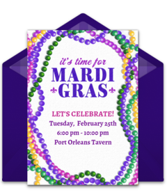 Don't forget invitations! Be sure to send online Mardi Gras invitations for your celebration. Text or email invites right from your phone, easily manage RSVPs, and communicate with your guests.