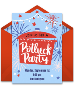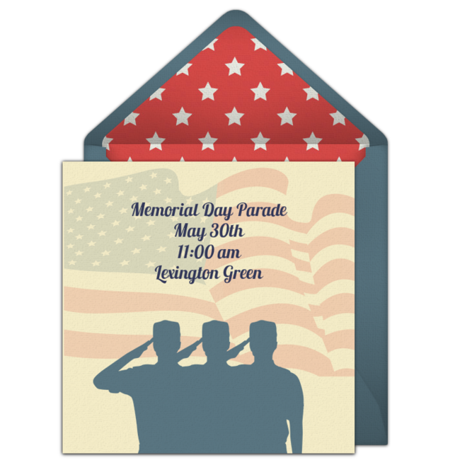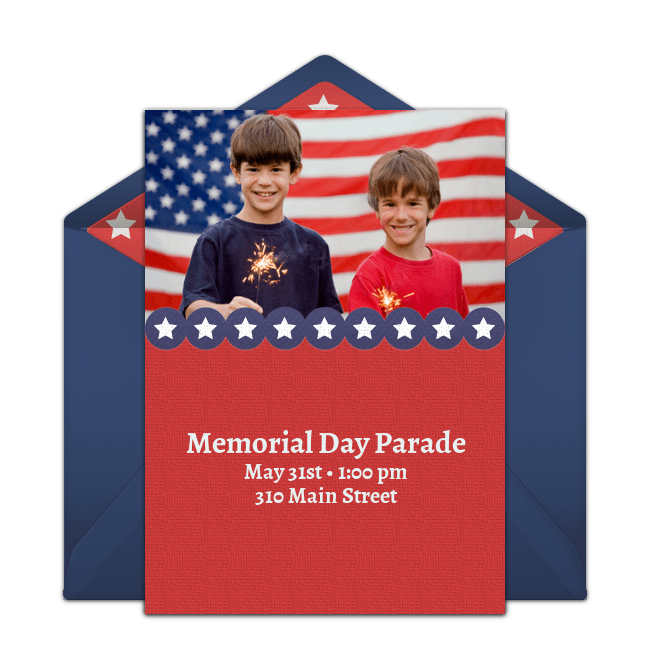 Memorial Day invitations are a great way to spread the word that you plan to host a special celebration such as a cookout or parade watching party. Select Memorial Day invites that display an American flag and the colors red, white and blue. Punchbowl has a variety of free Memorial Day invitations in a range of designs fit for the occasion. Here are just a few of the patriotic themed invites that can be customized for your Memorial Day party: