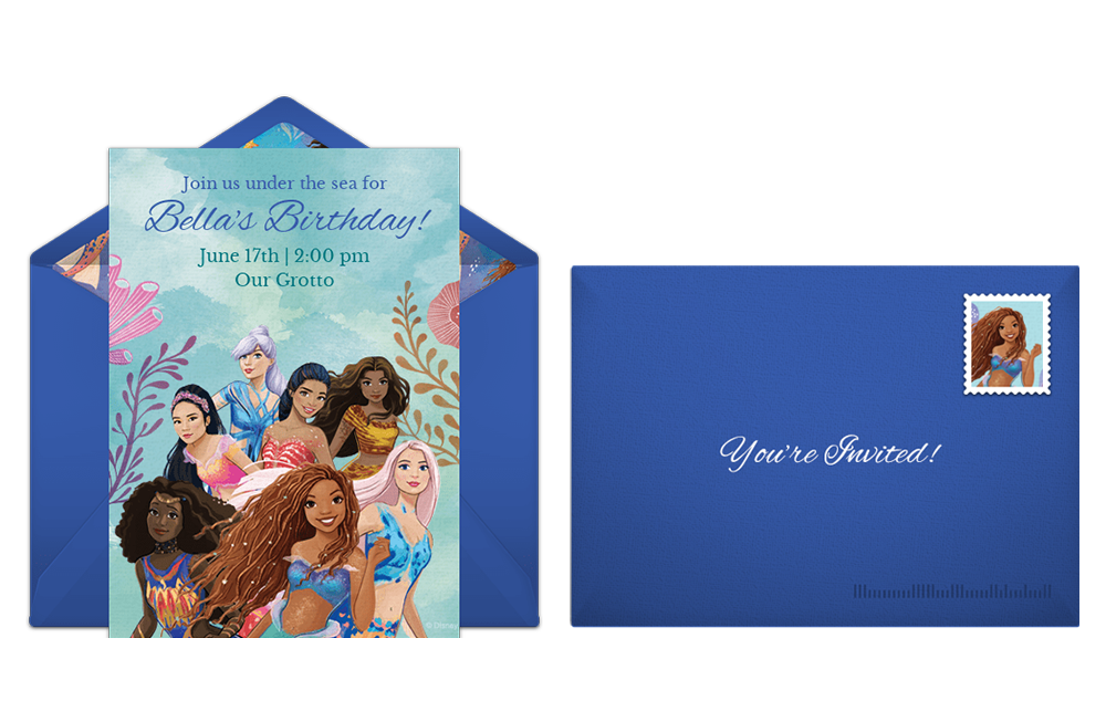 Make a splash with a magical Little Mermaid birthday party inspired by Princess Ariel! To begin your party planning, personalize a dazzling digital invitation that will enchant your guests from the moment they open it. Punchbowl offers Little Mermaid online invitations with whimsical scenes perfect for any young daydreamer.