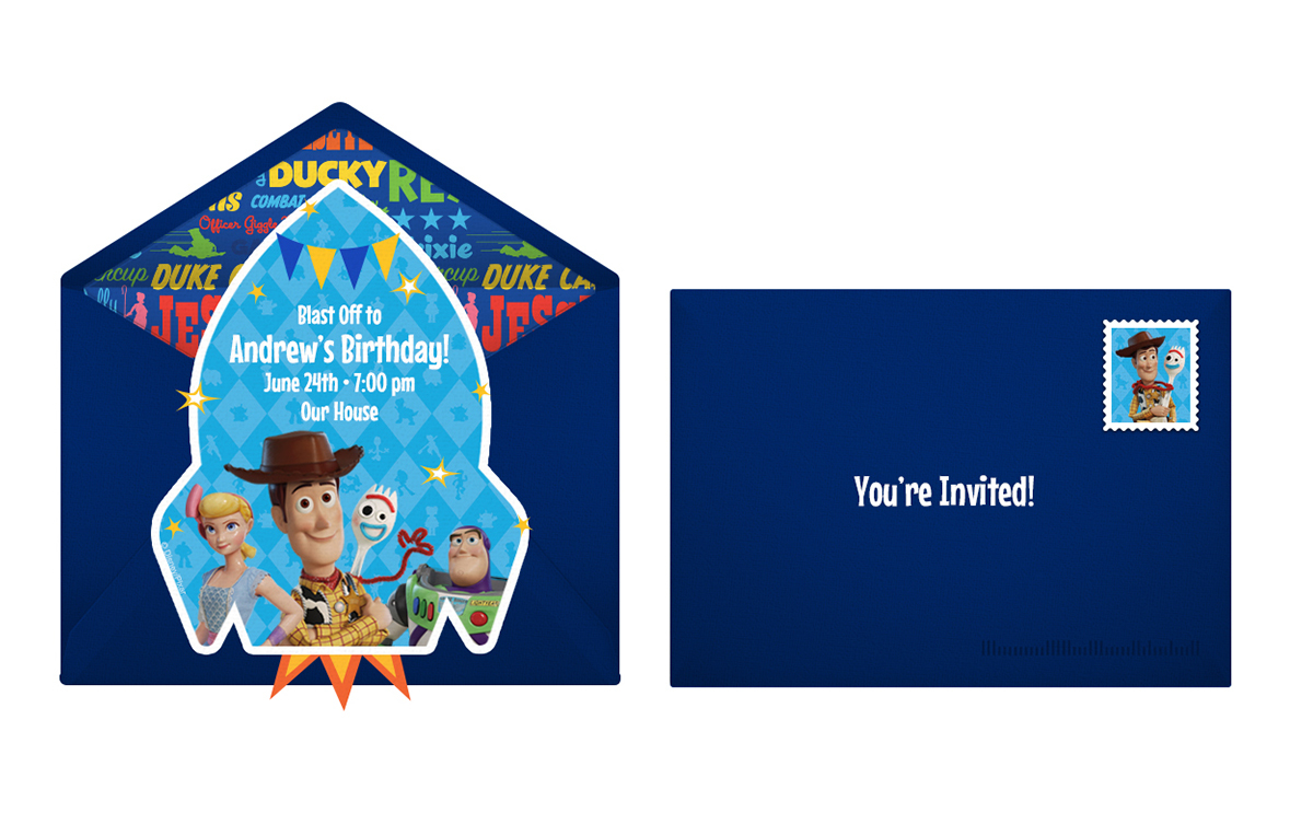 Customize this free Toy Story 4 invitation featuring a unique rocket die cut shape!