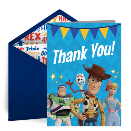 - Say Thanks: After the celebration, send Toy Story Thank You cards online to let guests know how much you appreciate them attending. Personalize the eCards and send via text or email in minutes.