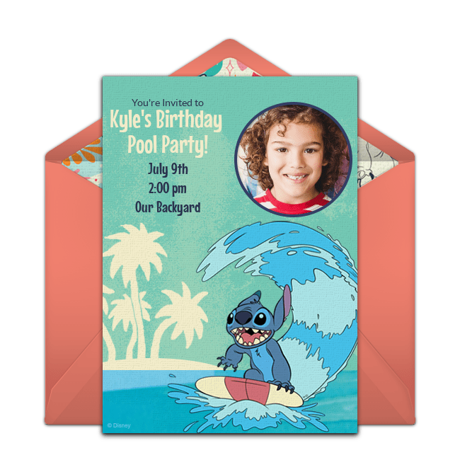 Upload a photo of the birthday boy or girl to this fantastic Surfing Stitch invitation. Once you pick your favorite design, customize it with the guest of honor’s name, party date, time, location, and any other details your guests should know. Once it’s just right, you can quickly and easily share your invitations via email, text, or social media.