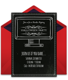 - Invitations: Send out free Halloween invitations with details such as the day and time of the party along with a link to the video chat platform you plan to use. You can also send a personal message to each guest with their invitation to give them a detailed description of the character they will play. All of the guests will be suspects of the murder of John or Jane Doe (a fictional character) and everyone will use clues to try and solve the crime. If you want to customize your invite, create your own unique Halloween design with our invitation maker layouts where you can upload your own photo or design.