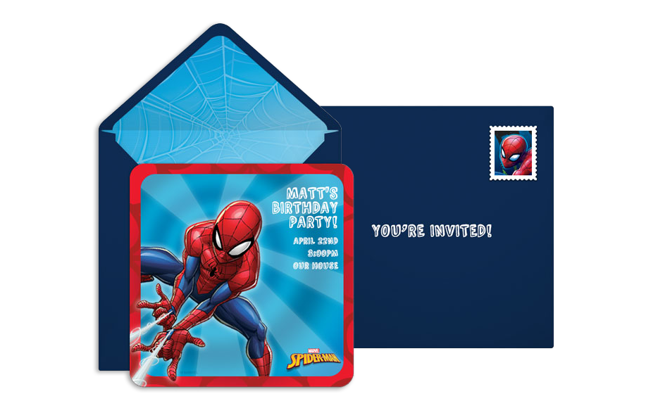 Celebrate the birthday boy or girl with a Spider-Man birthday party! From action-packed online invitations to inspiring party ideas, Punchbowl can help you plan an unforgettable party. Get started with our exclusive collection of Spider-Man online invitations. This exciting design features a dynamic Spidey design, and is the perfect way to kick off a super birthday celebration.