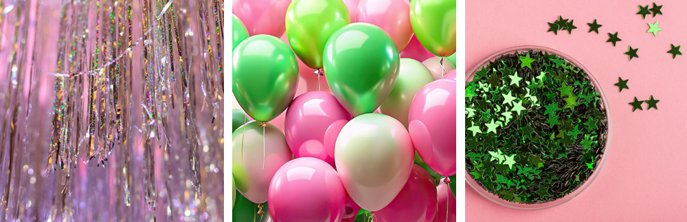 Keep things simple and on theme with pink and green streamers, balloons, and confetti throughout your party space. Decorate the table with pink and green tablecloths, cutlery, and napkins to match. Finally, add some sparkle and shine with decorations that incorporate metallics and glitter.