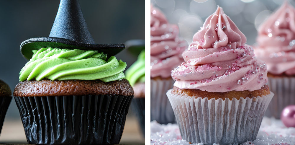 Elphaba & Glinda Inspired Cupcakes: Offer guests pink-frosted cupcakes sprinkled with edible glitter and green-frosted cupcakes adorned with a black fondant witch’s hat.