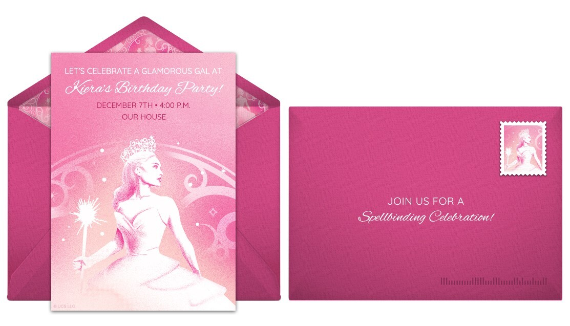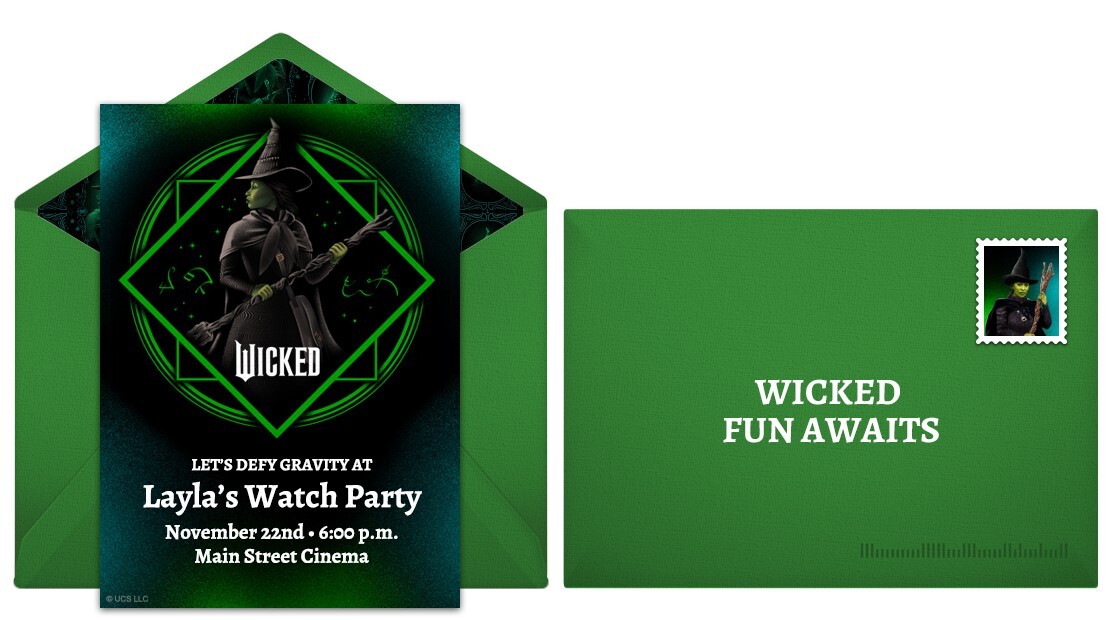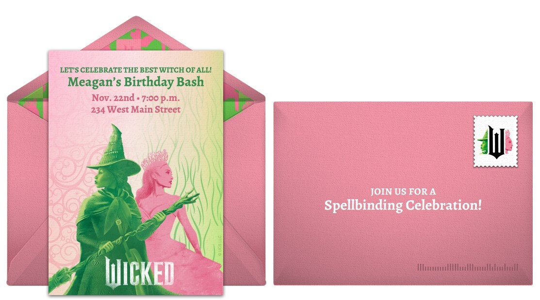 Set the stage for an amazafying party with gorgeous digital Universal Pictures’ Wicked themed party invitations complete with matching postage stamps and envelope liners. Customize your invitation with important event details, send it to guests by text or email, then easily manage RSVPs online.