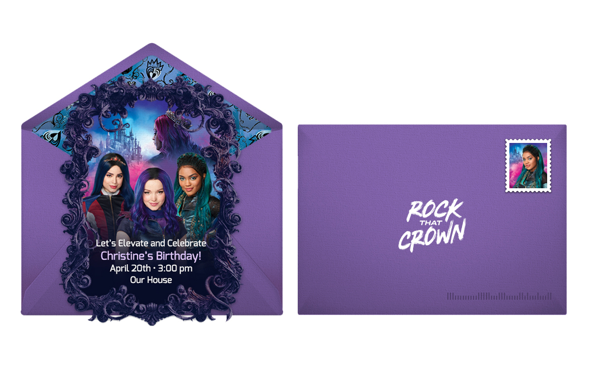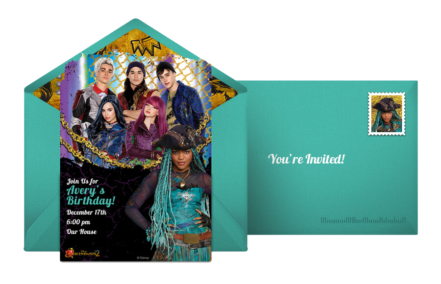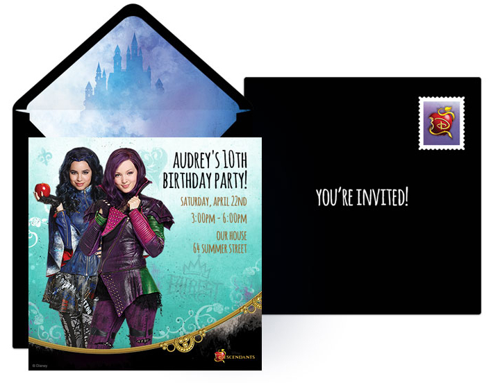 Transport your party guests straight to Auradon with a Descendants themed birthday party! Punchbowl can help you plan a wicked party with this exclusive Descendants online invitation featuring your favorite Descendants characters, as well as inspiration for your party decorations, food, activities, and more. You can also customize this free Descendants 2 invite featuring popular characters like Uma, Evie, Mal, and more!