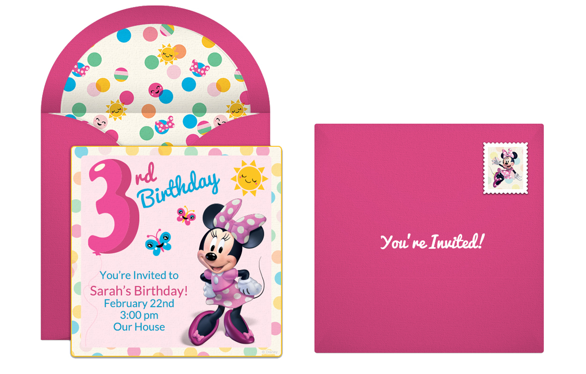 Or, customize this adorable Minnie invite for a 3rd birthday with the guest of honor’s name, party date, time, location, and any other details your guests should know. Once it’s just right, you can quickly and easily share your invitations via text message, email or social media.