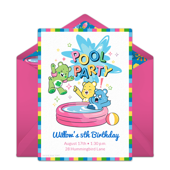 When the logistics are sorted out, share important event information with customizable online pool party birthday invitations. Choose from a wide range of cute and gorgeous designs including invitations that feature favorite kid characters. Once you find your favorite design, incorporate pool-themed language into your invite to get guests excited about the event, like "Splish, splash, it's Mia's birthday bash!" or "The sun is hot but the water is nice + cool. Come splash + play at Sam's birthday party in the pool!".