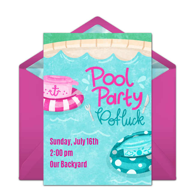 We get it. You’re busy. If you want to throw a pool party but feel overwhelmed at the thought of feeding everyone, host a potluck! Not only will it save you time, you’ll also get to experience your guests’ favorite dishes and recipes. Send this pool party potluck invitation and use the potluck sign up tool to organize who is bringing what app, side, dessert, or beverage. You can either specify how many dishes you need and outline specific items, or leave it up to your guests to add what they’d like to bring. Not sure what to make for a dish? Check out these summer appetizer recipes.