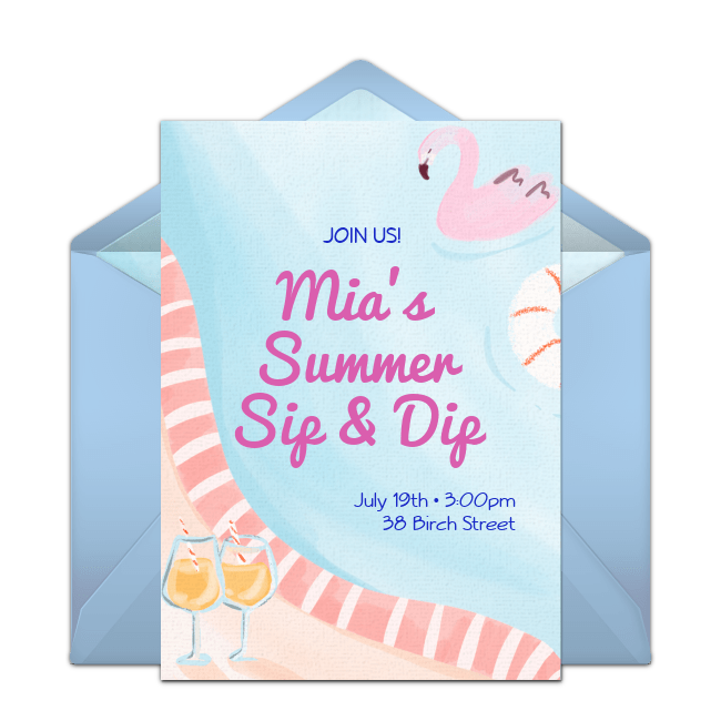 Enjoy yummy summer cocktails poolside! To start, send these orange Sip & Dip party invitations or these blue Sip & Dip party invitations that feature a cute flamingo float. Check out these five unique margarita recipes and this easy pina colada recipe for drink inspiration, then set up a “Sipping Station” with all the fixings including ice, garnishes, and straws. Provide clear plastic cups so guests can see and appreciate the beautiful colors of their drinks and be sure to have plenty of snacks for them to munch on!