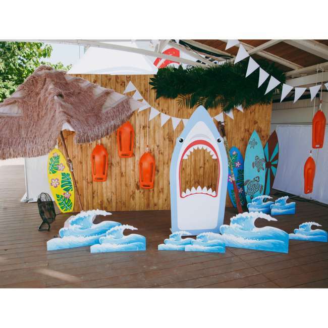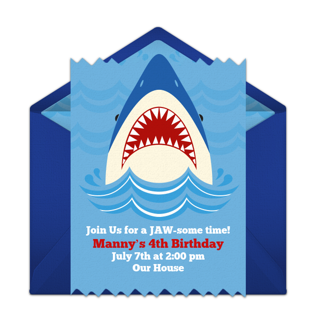 Host a “fintastic” shark themed pool party with shark pool party invitations like this Shark Bite invite. Decorate your yard with DIY signs that say “Warning: Shark Activity, ” “No Lifeguard on Duty,” and “Swim at Your Own Risk.” For pool games, play “Sharks and Minnows,” where one person is the “shark” and tries to tag the other players (the “minnows”), as they try to cross to the other side of the pool. Once minnows are tagged, they become sharks and the game ends when only one minnow remains!