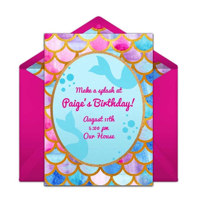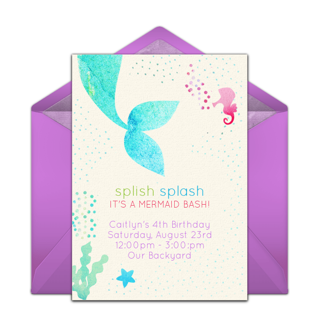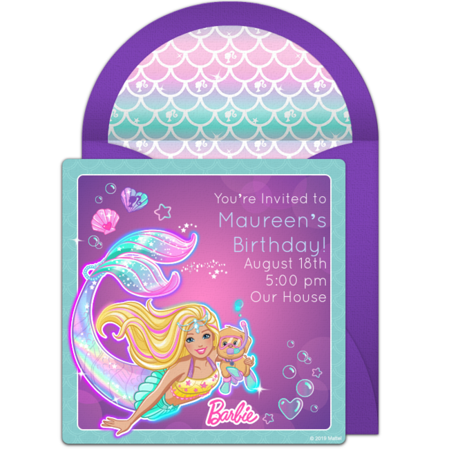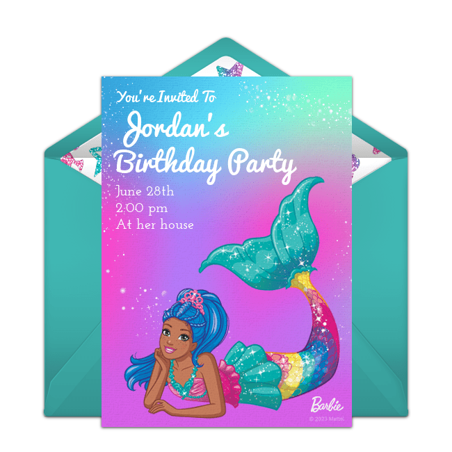Make a splash with a mermaid themed pool party! Browse gorgeous mermaid pool party invitations or Barbie pool party invitations that feature the beloved character as a magical mermaid. For decorations, incorporate teals, blues, greens, and purples into your party space to create an underwater ambiance. Guests can play a relay race game where teams have to try to swim with their legs together (like a mermaid!) through a hula hoop held by a parent, then back to their teammates. For food, use cookie cutters in star and fish shapes to turn sandwiches and Rice Krispie treats into star fish and other sea creatures.