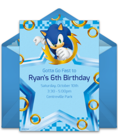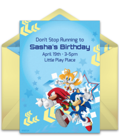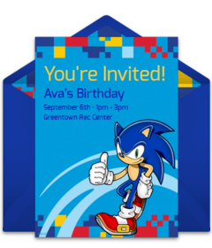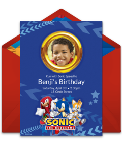 Set the stage for your party with online Sonic birthday invitations that feature favorite characters like Knuckles, Tails, and Doctor Eggman. Add important event details to your Sonic invitation and customize the fonts, colors, and more. You can even upload a picture of the birthday kid to a photo Sonic birthday invitation! Once your invitation is ready, send it by text or email and easily track RSVPs online.